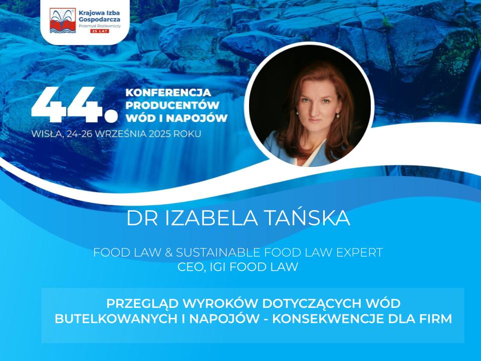 Dr Izabela Tańska, food law & sustainable food law expert CEO w IGI FOOD LAW, przedstawi temat: „Przegląd wyroków dotyczących wód but...