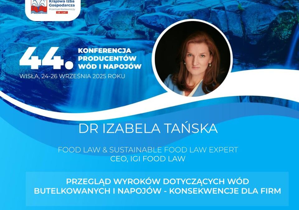 Dr Izabela Tańska, food law & sustainable food law expert CEO w IGI FOOD LAW, przedstawi temat: „Przegląd wyroków dotyczących wód butelkowanych I napojów – konsekwencje dla firm”.